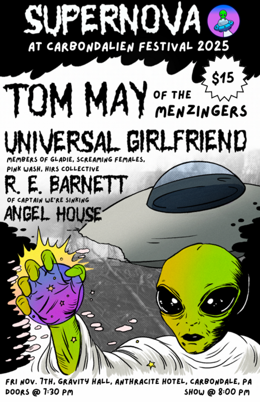 We are thrilled to announce SUPERNOVA at the Carbondalien! This post-parade concert kicks-off at 8:00 PM and features an all-star line-up including Tom May of the Menzingers, Universal Girlfriend featuring members of Gladie, Screaming Females, Pink Wash and Hirs Collective, R.E. Barnett of Captains We’re Sinking and Angel House. Limited tickets available online until tickets sell out.